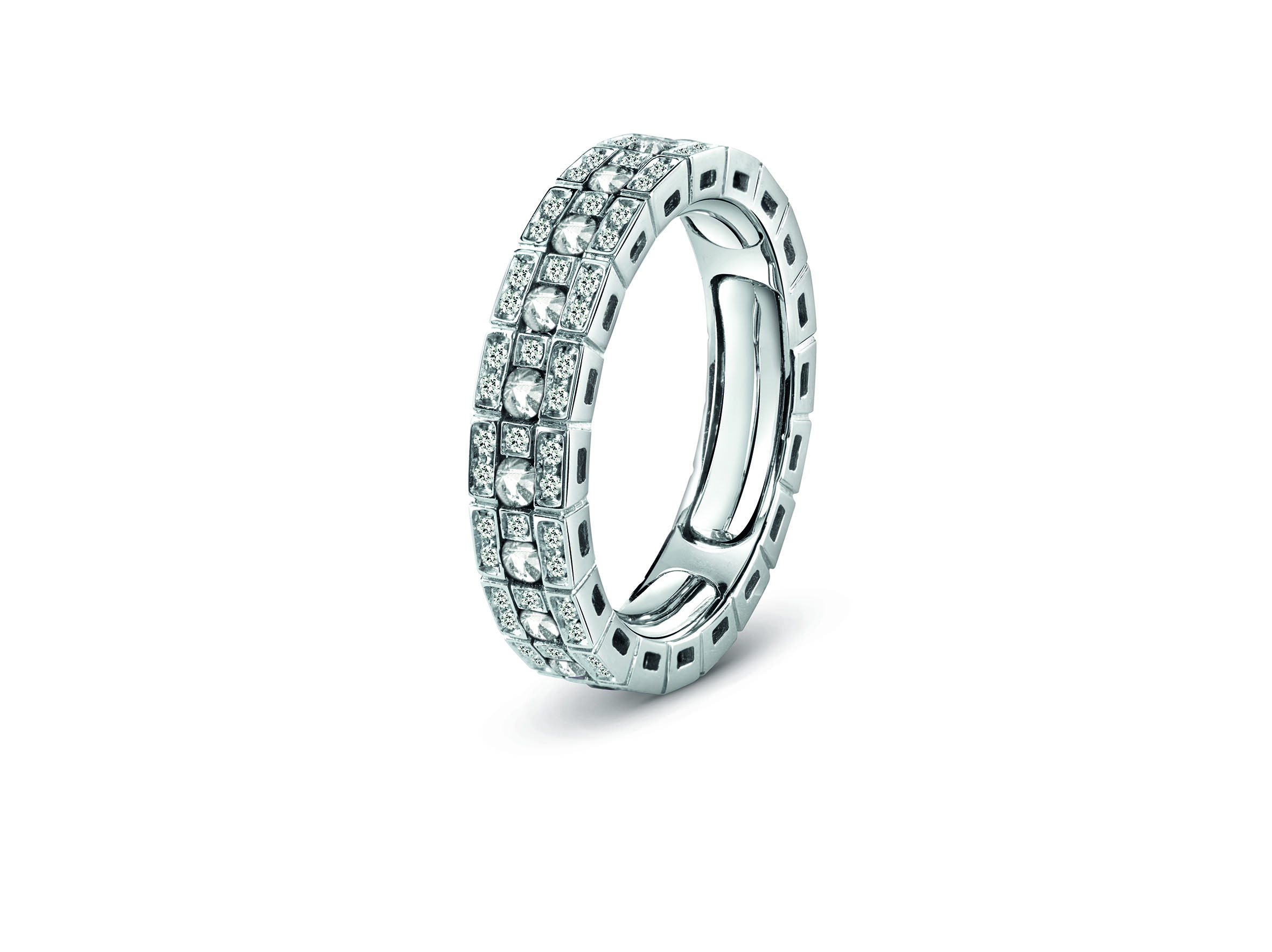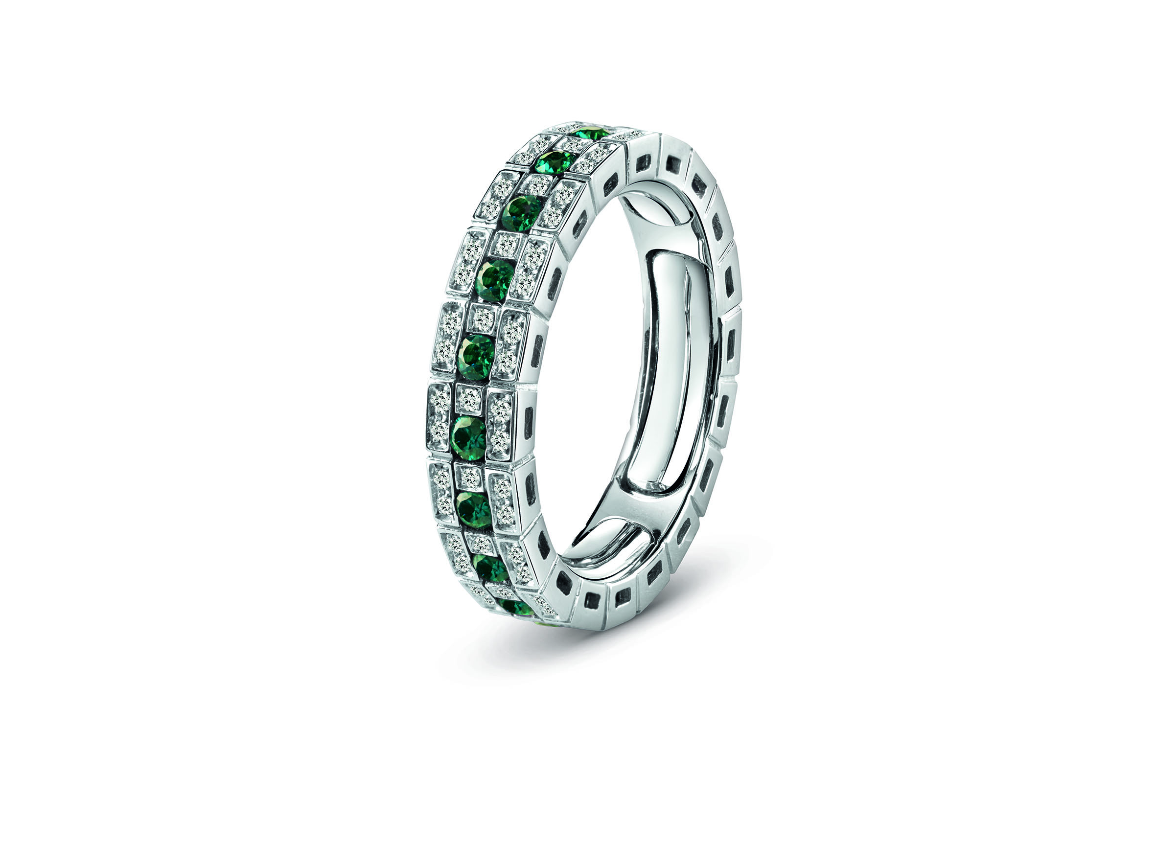 La caratterizzano l’oro bianco unito a diamanti, zaffiri, rubini e smeraldi enfatizzati da riquadri brillanti che esaltano i cromatismi delle pietre preziose.