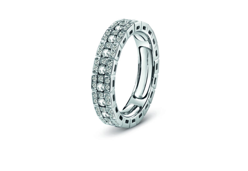 Gli anelli della collezione “Belle Époque” sono cinque, e tutti dotati da un sistema di adattabilità, Eternal comfort, che grazie al movimento e alla precisione di cuscinetti interni alla corona dell’anello consente una vestibilità perfetta.