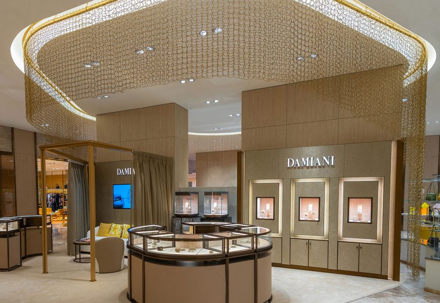Damiani inaugura un nuovo store presso il celebre 360 Mall di Kuwait City. Situata vicino ai principali marchi del lusso, la nuova boutique Damiani è stata aperta in Join Venture con la famiglia Behbehani, una delle più importanti del paese attiva in svariati settori, oltre a quello del luxury. Studiato per consentire agli appassionati di scoprire le creazioni del brand grazie a un’attenta disposizione degli spazi, il punto vendita presenta tre isole espositive, caratterizzate da arredi e dettagli pregiati sui toni del beige, del sabbia e del marrone, con tocchi gialli e dorati, oltre a una speciale VIP room e un salottino riservato per le vendite.