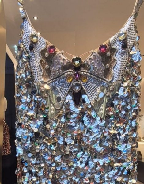 Come essere “sparkling” a Capodanno? Con un abito a sottoveste fitto di paillettes giganti argento, arricchito da una spruzzata di cristalli Swarovsky su di un “ricamo” a farfalla gigante sul davanti.